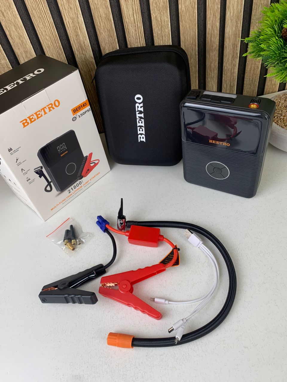 هذا الجهاز الذكي يجمع بين القوة، الأمان، والراحة — يمكنك تشغيل سيارتك، نفخ الإطارات، وشحن أجهزتك الإلكترونية في أي وقت وأي مكان.