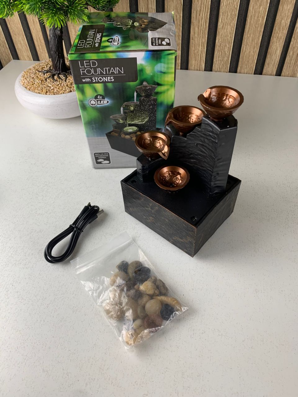 الإضاءة المدمجة LED تُبرز جمال حركة المياه وتضيف توهجًا لطيفًا يجعل النافورة قطعة ديكور رائعة سواءً على المكتب أو الرف أو طاولة القهوة.