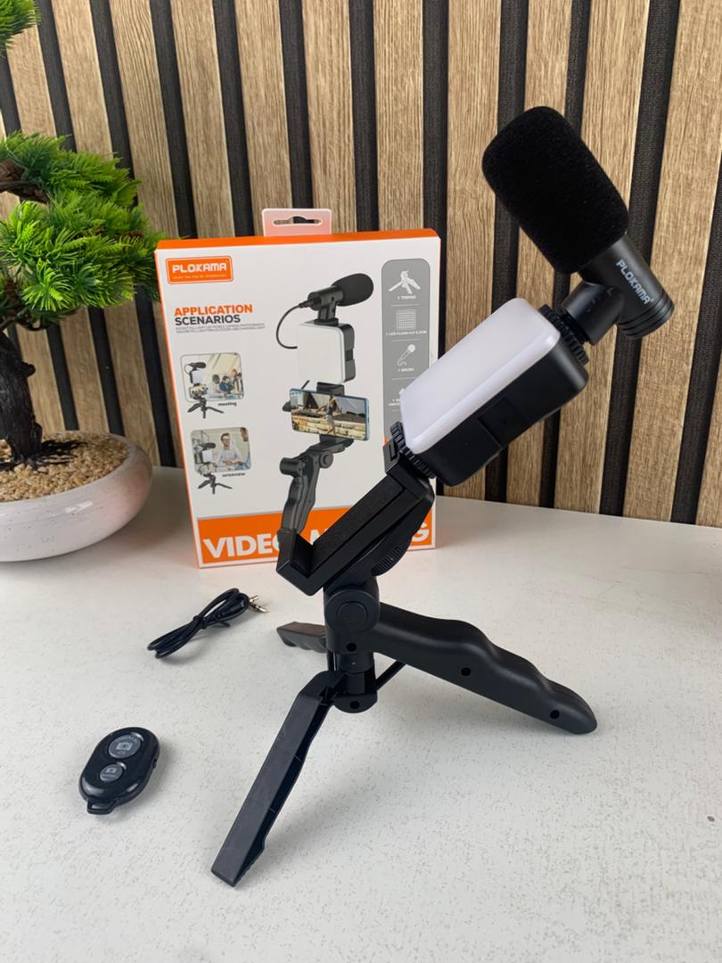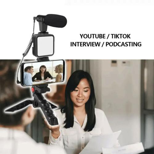 نظام إضاءة LED، ميكروفون احترافي، وحامل هاتف قابل للتعديل — إعداد متكامل لتصوير فيديو عالي الجودة في أي مكان.