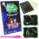 Un kit pour dessiner dans le noir. Il y a une diode LED sur le capuchon du marqueur, qui peut être activée en appuyant sur le bouton situé sur le côté du capuchon. Pour commencer à dessiner, dirigez la lumière vers le tableau. Placez le marqueur perpendiculairement au tableau et ajustez la distance appropriée entre le marqueur et la surface luminescente : plus elle est proche, plus la ligne est nette et lumineuse. À mesure que la lumière diminue, la ligne semble se disperser et se brouiller. Positionnez le marqueur en biais par rapport à la tablette, cliquez et tracez une ligne pour créer un effet de bord flou. Les dessins ne peuvent pas être effacés, ils disparaissent progressivement au bout de 30 à 40 minutes, mais chaque ligne nouvellement tracée sera plus lumineuse que la précédente. De plus, le marqueur possède une encre invisible pour une écriture secrète qui apparaît sous la lumière d’une lampe de poche LED. La surface luminescente ne peut pas être peinte ou écrite avec de l’encre, car elle ne peut pas être retirée du tableau. Lors du changement des piles, dévissez le haut du capuchon et tirez doucement sur la LED, retirez les anciennes piles et insérez les nouvelles.