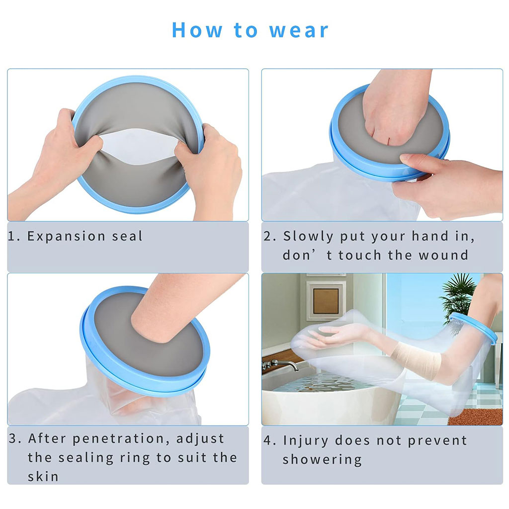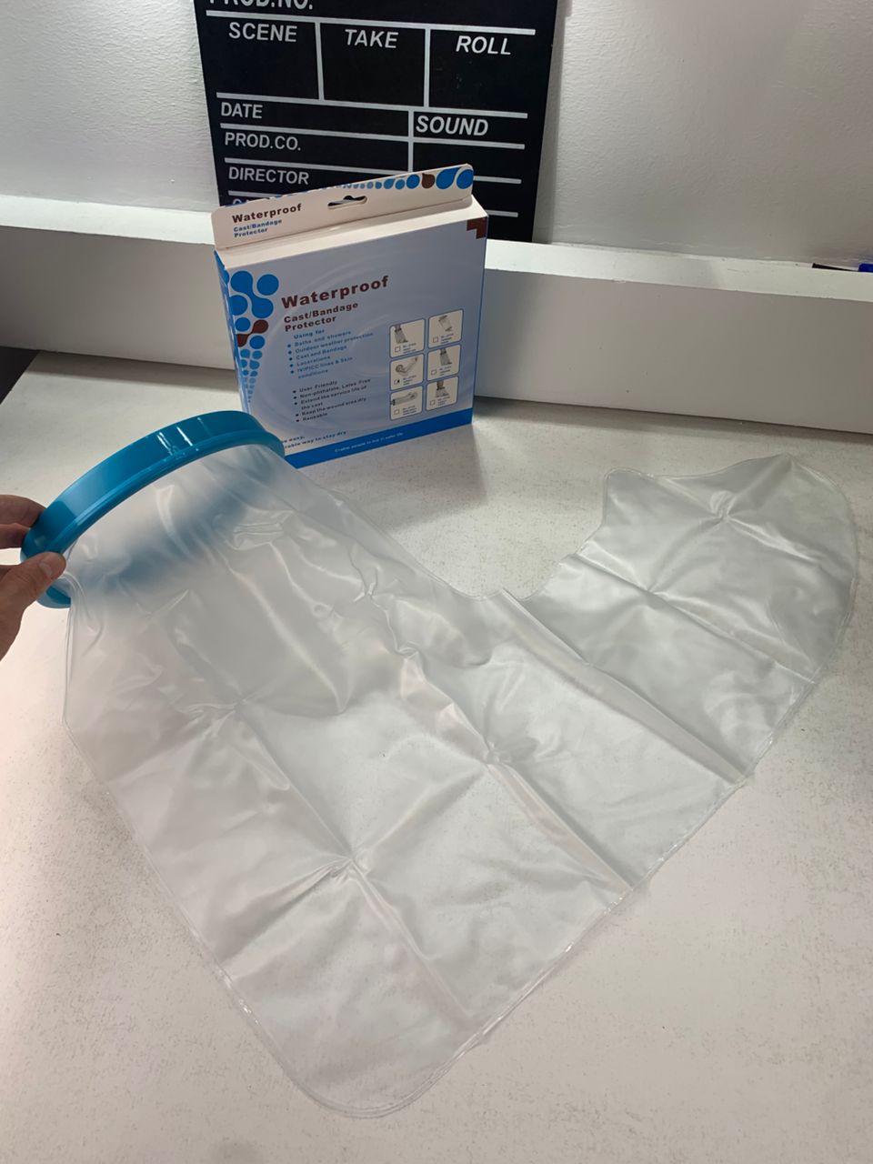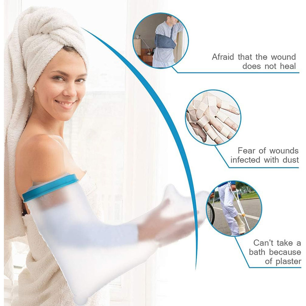 بطول 60 سم، يغطي الذراع بالكامل، مما يجعله مثاليًا لحماية الأصابع والذراع. مصنوع من مادة خفيفة، صحية وقابلة للغسل، لا تلتصق بالذراع. الفتحة المركزية المرنة، التي يمكن أن تمتد حتى 15 سم قطرًا، واسعة بما يكفي لمرور الجبيرة، وفي الوقت نفسه محكمة بما يكفي لمنع تسرب الماء.