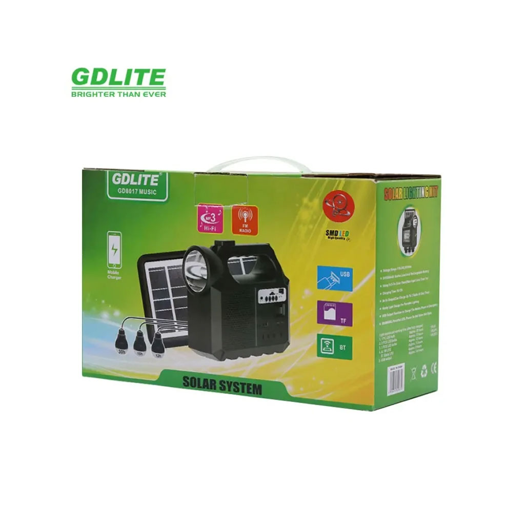 🔆 نظام الإنارة بالطاقة الشمسية GDLITE GD8017نظام GDLITE GD8017 هو حلّ مثالي للإنارة الذاتية، مناسب للمناطق الريفية، التخييم، الطوارئ، ولاستعمالات المنزل وقت انقطاع الكهرباء. يجمع ما بين الإنارة LED، راديو FM، مكبّر صوت، وشحن USB… كامل هذا في جهاز واحد صغير، عملي وسهل النقل. بفضل اللوح الشمسي تاعو، يشحن نهار كامل ويعطيك ساعات طويلة من الضوء، الموسيقى، وشحن الهاتف… بلا كهرباء وبلا مصاريف. يجي معه 3 لمبات LED تركّبهم بسهولة، ويقدر يخدم حتى كـ باور بنك صغير باش تشحن تليفونك ولا أي جهاز صغير عبر USB.✨ المميزات الرئيسية🔋 طاقة شمسية 100%لوح شمسي 9V يشحن البطارية الداخلية نهار كاملاقتصاد في الطاقة + خدمة بلا انقطاع💡 إضاءة LED قوية3 لمبات LED :2 × لمبة 3W1 × لمبة 2Wمناسب للبيت، للبرا، للحديقة، للخيمة…📻 راديو FM مدمجتسمع المحطات المحلية وين ما تكون🔊 مكبّر صوت / Music Playerيخليك تشغل الموسيقى وقت الرحلات أو في الدار🔌 مخارج USB متعددةتشحن الهاتف والأجهزة الصغيرةمخرج 6V باش تخدم حتى 4 أجهزة في نفس الوقت🔦 مصباح يدوي مدمجمفيد في المشي، البحث، الطوارئ🔋 بطارية قويةبطارية داخلية 6V 4Ahتدوم ساعات طويلة بعد الشحن🚚 سهل الحمل والاستخدامتصميم صغير وخفيفمناسب للسفر، للتخييم، وللمناطق بلا كهرباء📊 المواصفات التقنيةالطراز : GDLITE GD8017عدد اللمبات : 3 (2×3W + 1×2W)البطارية : 6V 4Ah Lead-Acidالطاقة الشمسية : لوح 9V (3–7W)وقت الشحن باللوح الشمسي : 13–15 ساعةالمخرجات :DC 6V (حتى 4 أجهزة)USB لشحن الهاتفالتوتر الكهربائي : 110–240V، 50/60Hzالوظائف :إضاءة LEDراديو FMمكبّر صوتشحن USBمصباح يدوي🌞 اختار GD8017… ضوء، موسيقى، وشحن كامل بالطاقة الشمسية!